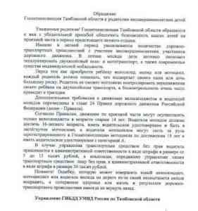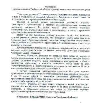 Обращение управления ГИБДД УМВД по Тамбовской области к родителям несовершеннолетних с просьбой обеспечения безопасности детей на проезжей части.