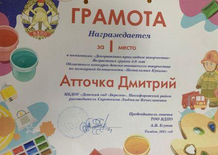 Поздравляем воспитанника средней группы Дмитрия Атточка и воспитателя Сироткину Людмилу Вячеславовну с победой в областном конкурсе детско-юношеского творчества по пожарной безопасности «Неополимая Купина» в номинации «Декоративно-прикладное творчество».