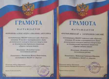 III место: Коллективная работа: Фролов Николай, Загороднев Савелий; 6 лет; «Правила дорожные знать каждому положено»; руководитель-Медведева Светлана Юрьевна.