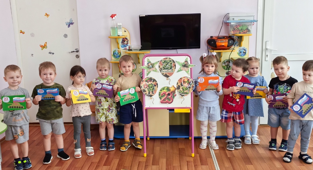 Воспитанники младшей группы поздравляют своих пап, дедушек и братьев с Днем защитника Отечества!!! Ребята с большим удовольствием и любовью сделали для них поздравительные открытки. С праздником, дорогие наши защитники!!!