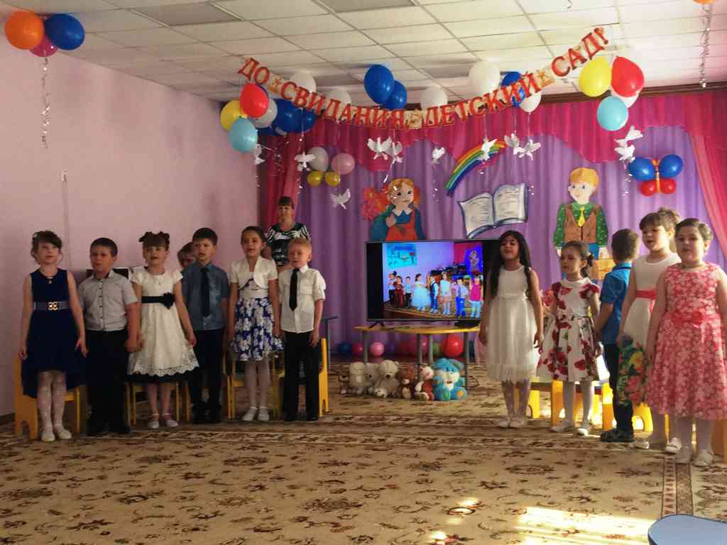 31 мая в детском саду прошел утренник, посвященный выпуску детей в школу. Дети с музыкальным руководителем и педагогами, родителями подготовили настоящее праздничное шоу, в которым рассказали об их жизни в детском саду, о том, как много они узнали и чему научились, как играли, дружили, росли. С этим праздником всех присутствующих поздравили заведующий ДОУ- Артамонова Галина Юрьевна и старший воспитатель Лазина Ирина Валентиновна, наградили каждого дипломом за успешное окончание детского сада, а родителям вручили благодарственные письма. Родители, в свою очередь, также поздравили сотрудников детского сада, подарив им незабываемое выступление. Самым необыкновенным подарком на память детскому саду от выпускников стала елочка, которую они посадили на территории учреждения. По окончанию вечера выпускники запустили в небо свои воздушные шары с голубками. Итогом торжества стал флешмоб, который исполнили родители, выпускники и педагоги детского сада.
