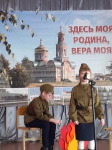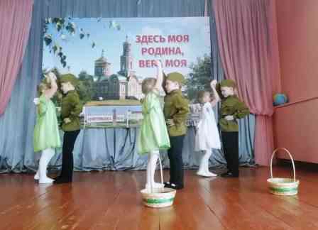 11 февраля воспитанники детского сада приняли участие в муниципальном духовно-нравственном и патриотическом фестивале «Здесь моя Родина, вера моя…». В номинации «Россия – родина Победы» дети приняли участие в трех жанрах. В жанре вокал — Медведева Анастасия исполнила песню «Красно солнышко» сл. И. Шаферана, муз. И. Аедоницкого, хореография — Конабеева Софья, Хабаров Прохор, Порядин Валерий, Медведева Анастасия, Просветова Дарья, Костиков Захар представили танец «Смуглянка», художественное слово представили литературную композицию «В землянке»: Хабаров Прохор стихотворение «В землянке» автор Алексей Сурков, Любогощинская Ксения стихотворение «Монолог медсестры» автор Елена Весна