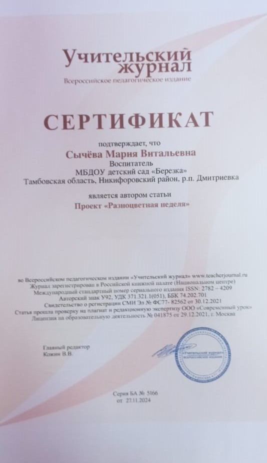Всероссийский педагогический Учительский журнал с работой с работой проект «Разноцветная неделя».