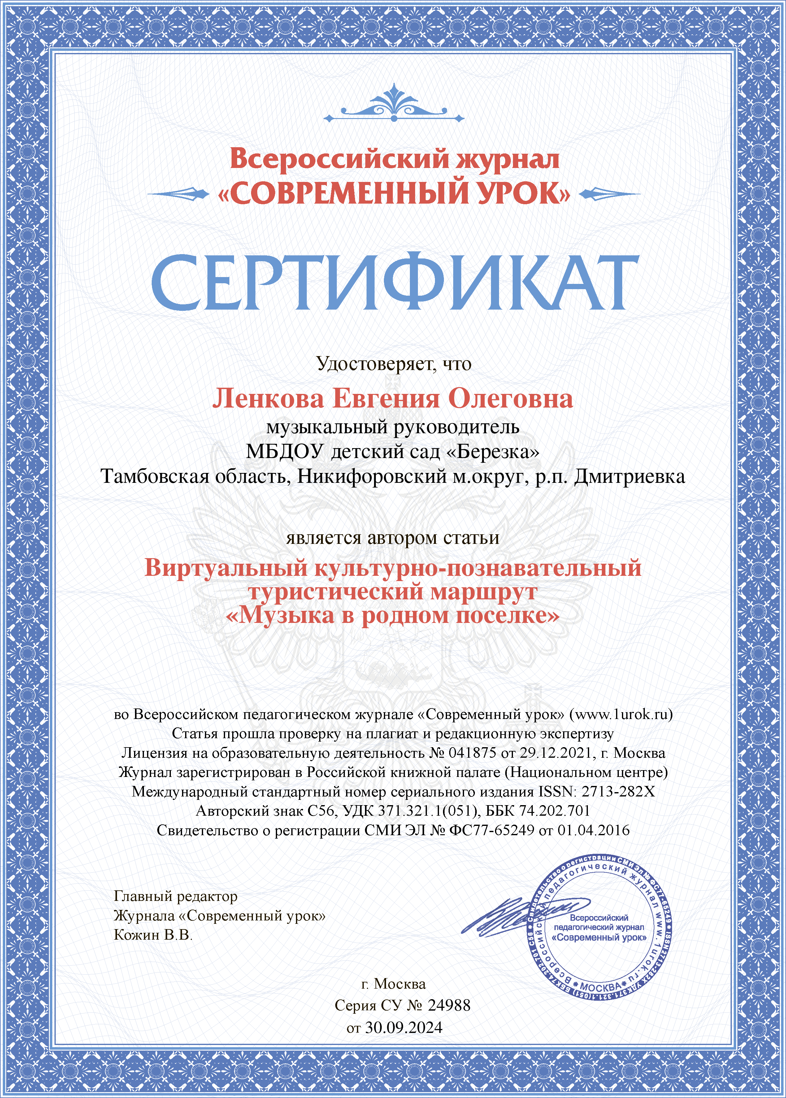 Всероссийский педагогический журнала «Современный урок». Виртуальный культурно-познавательный туристический маршрут «Музыка в родном поселке»