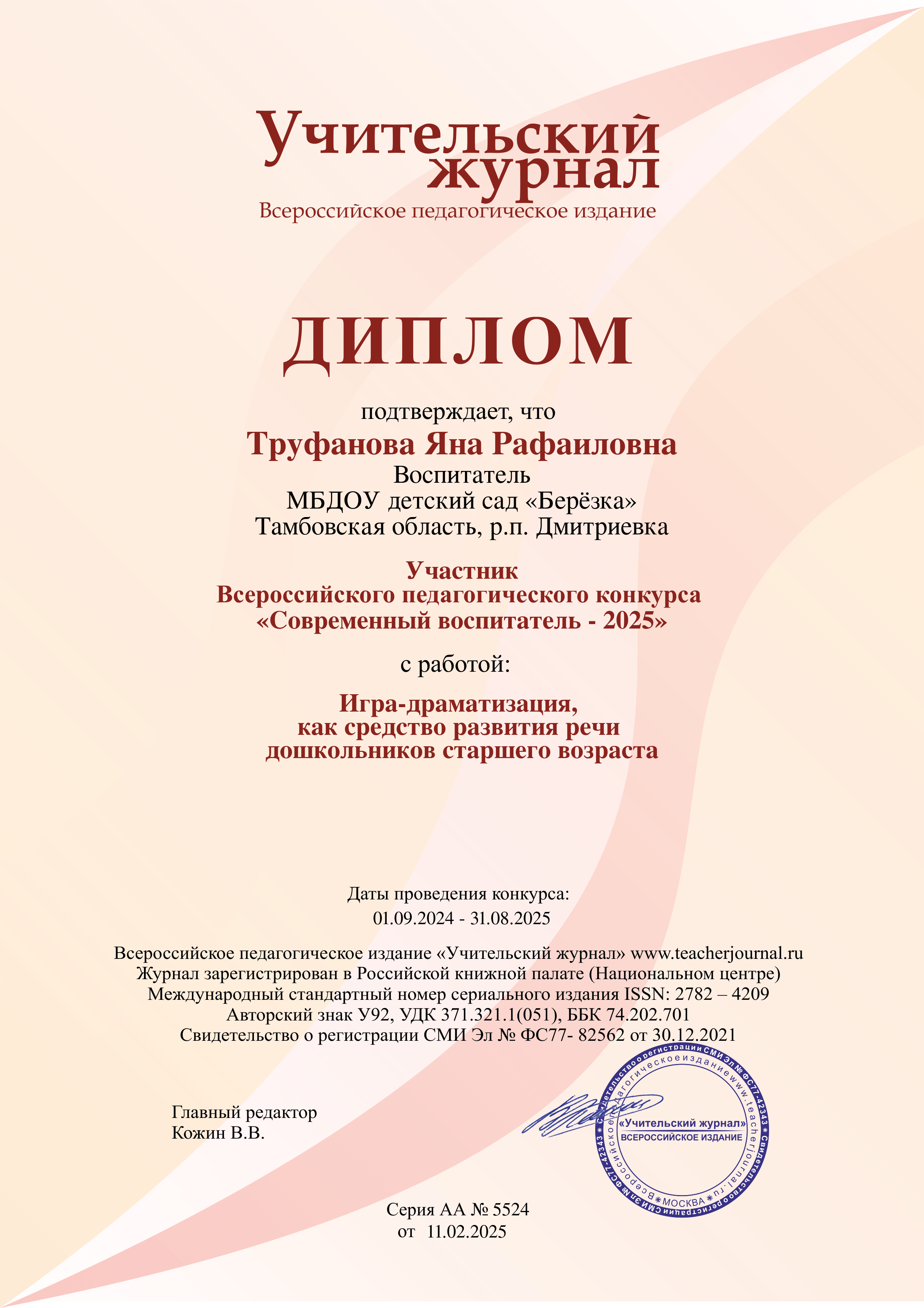 Всероссийский педагогический Учительский журнал   с работой. Статья «Игра-драматизация как средство развития речи дошкольников старшего возраста»