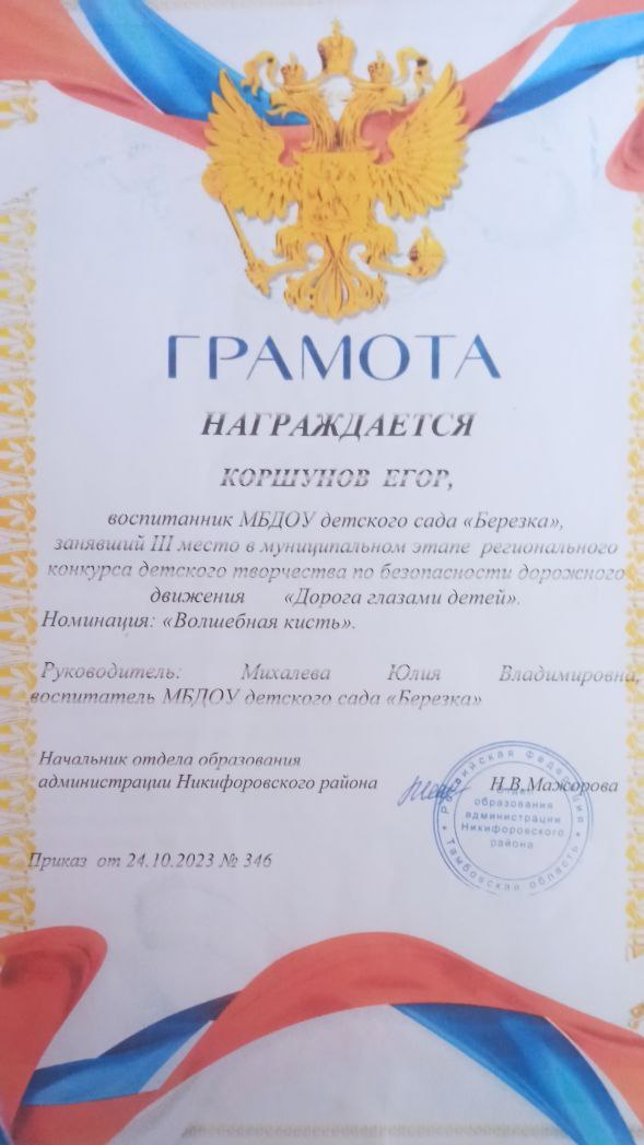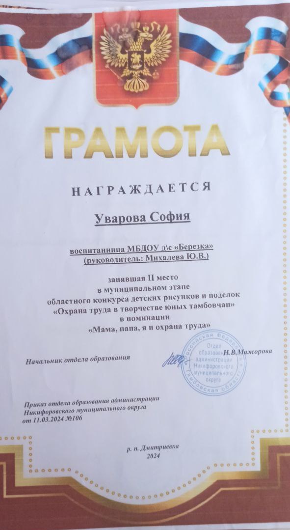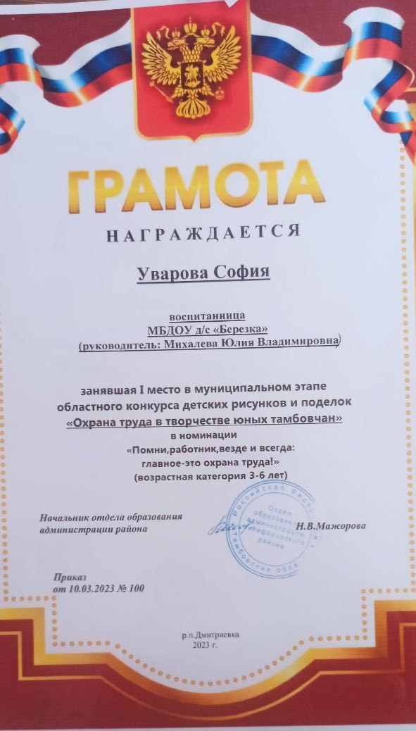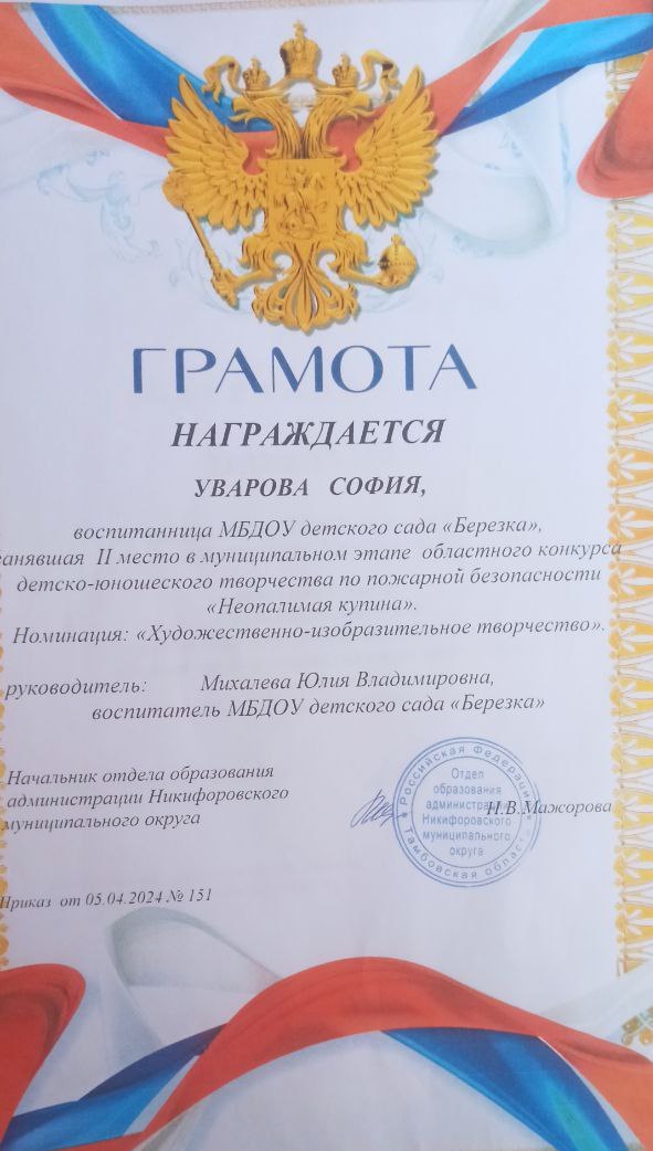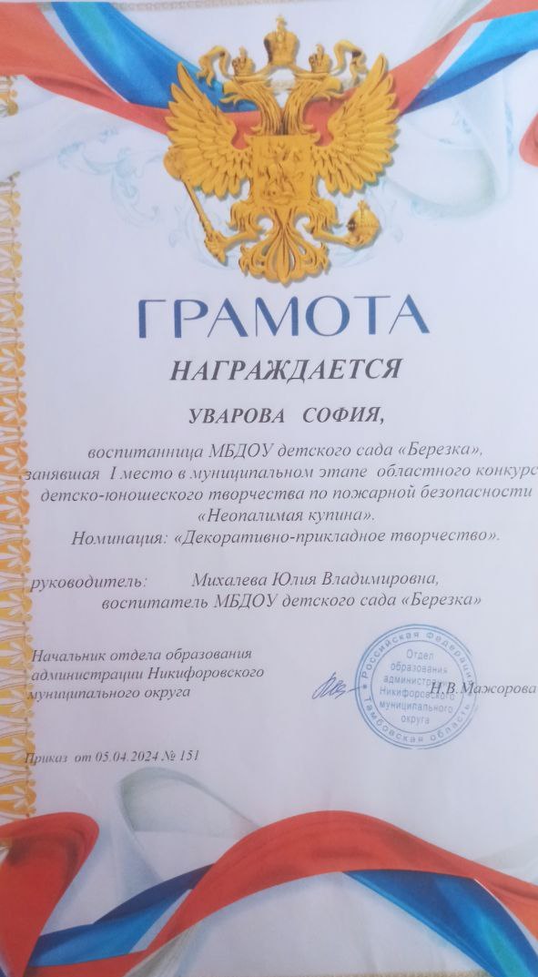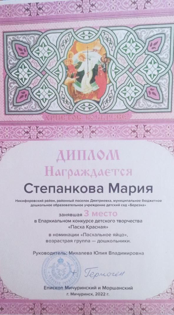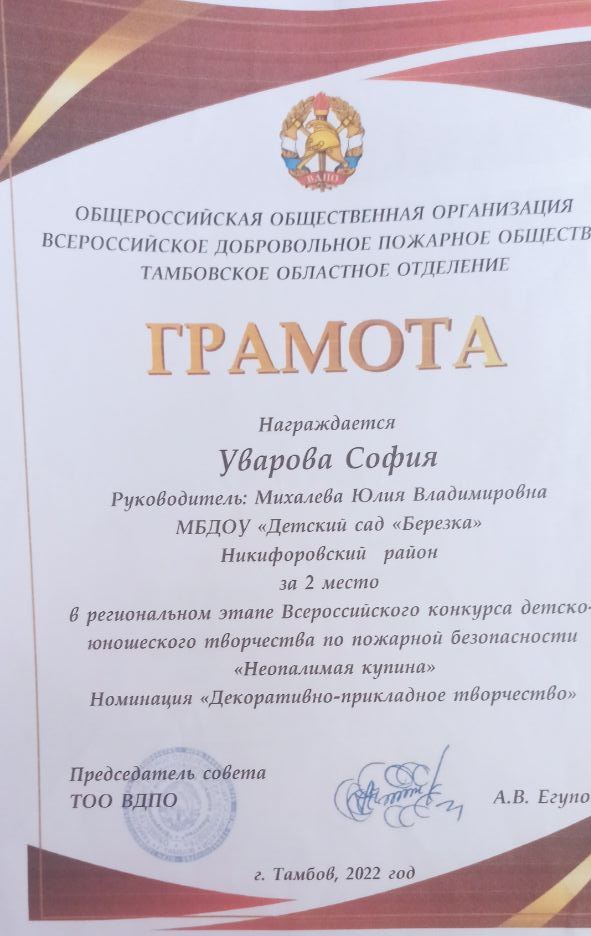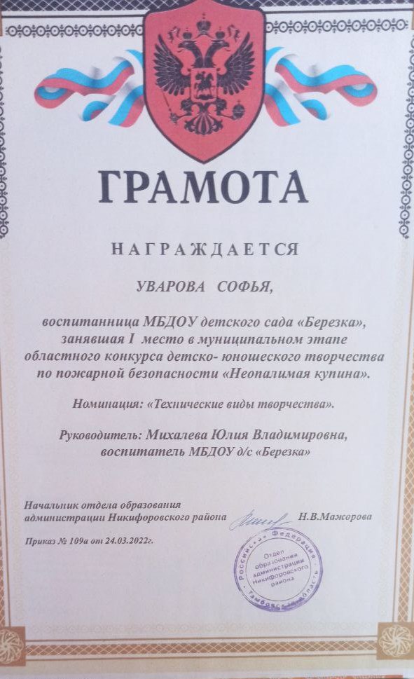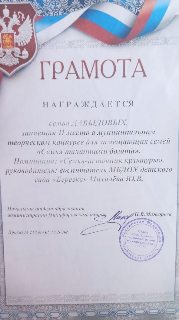 Награды:Благодарственное письмо администрации Никифоровского района, 2020 г.