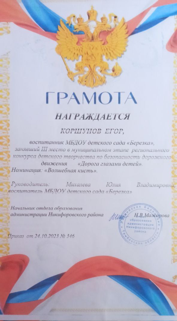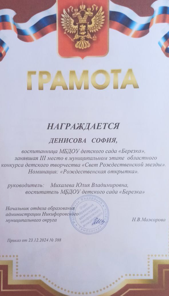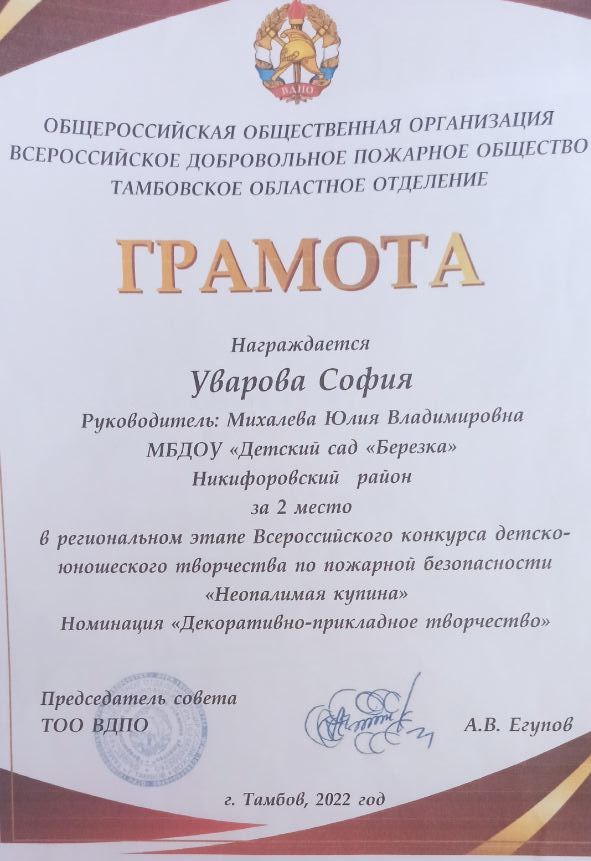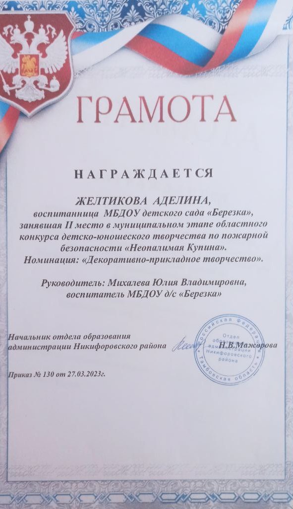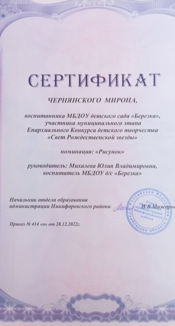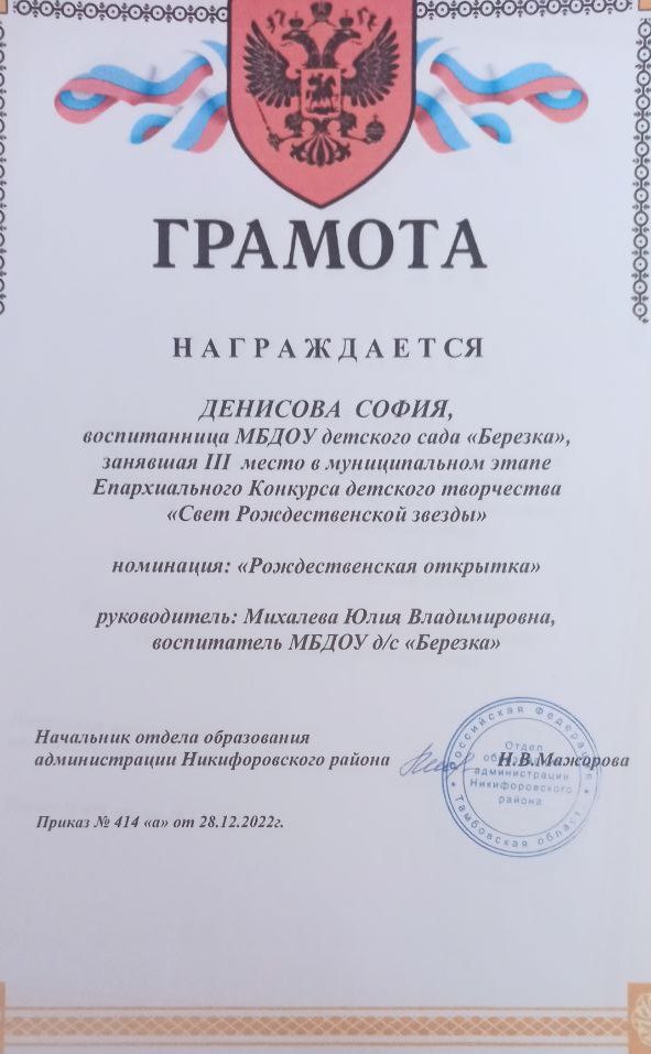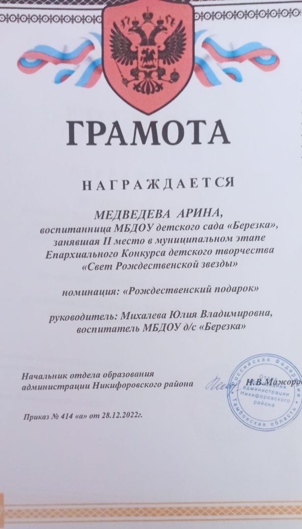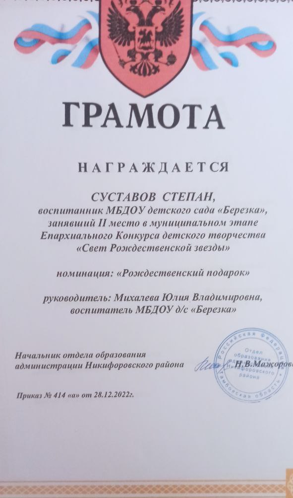 Благодарственное письмо администрации Никифоровского района, 2022 г.
